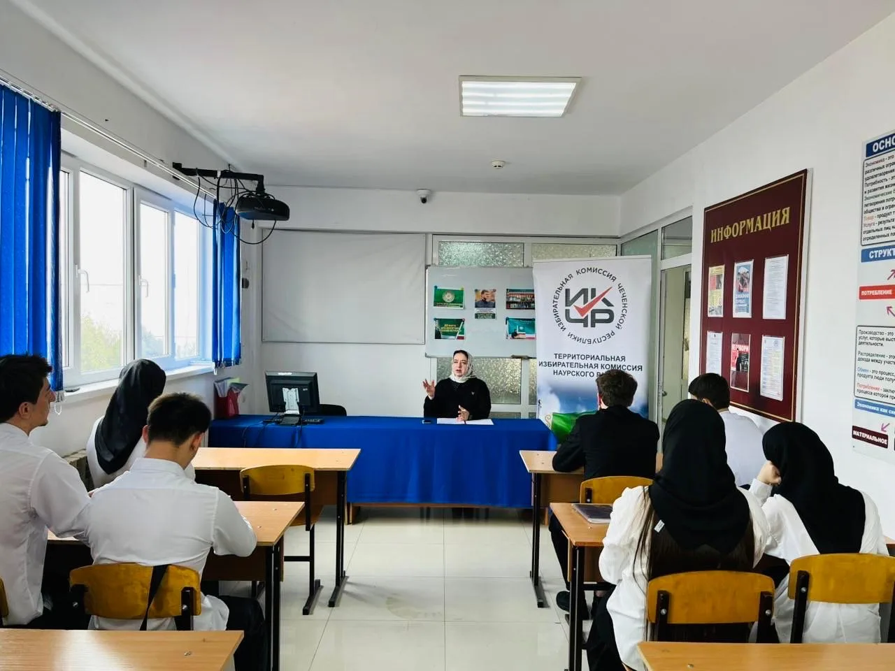 Референдум 2003 года стал ключевым моментом в процессе стабилизации общественно-политической ситуации и выходом из кризиса. Жителям Чеченской Республики предстояло ответить на вопросы о принятии Конституции, а также о выборах Президента и Парламента Чеченской Республики. Принятие Конституции означало переход от периода прямого управления и поиска консенсуса к формированию легитимных органов власти в рамках правового поля Российской Федерации. Для многих участников тех событий это стало сигналом к завершению этапа активных военных действий и переходу к созидательной работе. Конституция стала фундаментом для дальнейшего развития всех государственных институтов. Эта поворотная в судьбах нашего народа общественно-политическая акция, проведенная в ЧР по инициативе Первого Президента Чеченской Республики, Героя России А-Х. Кадырова (Дала гIазот къобал дойла цуьнан!), была единственным и необходимым политическим условием для полного восстановления конституционных органов государственной власти в республике. Референдум, на котором был принят Основной Закон, состоялся при самом активном участии избирателей: явка по республике составила 95%. И практически все они проголосовали за предложенный проект конституции ЧР.В завершении встречи ребятам было предложено разгадать кроссворд по избирательному праву, с чем они успешно справились.